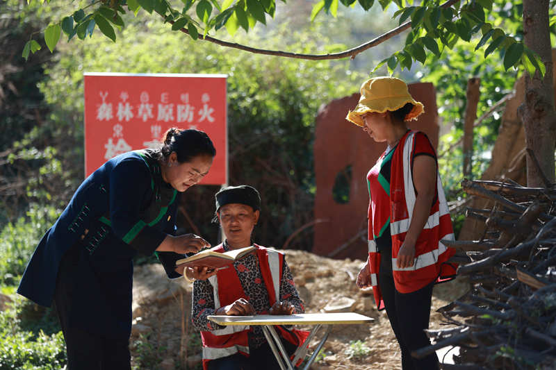 5月9日,全国人大代表、四川省凉山彝族自治州昭觉县庆恒村党支部书记吉克石乌(左)在村口森林草原防火检查点查看进出人员登记情况。新华社记者 江宏景 摄