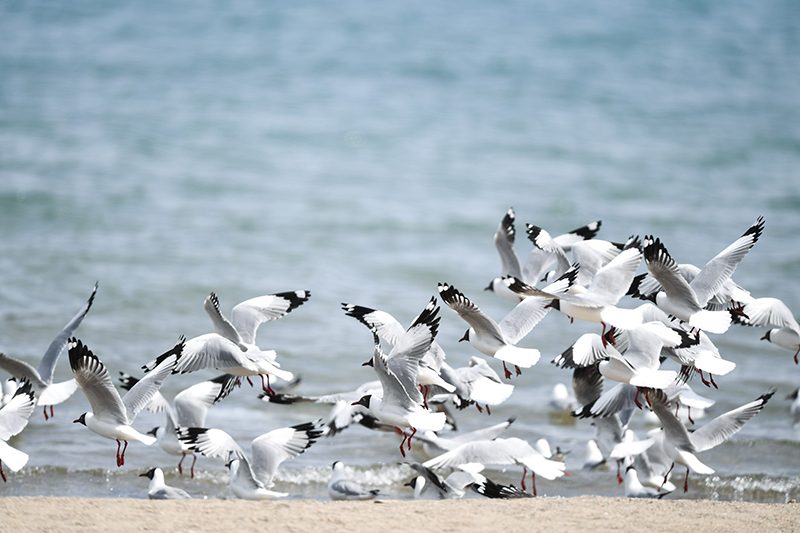 4月8日,一群棕头鸥在青海湖岸边飞翔。新华社记者 吴刚 摄