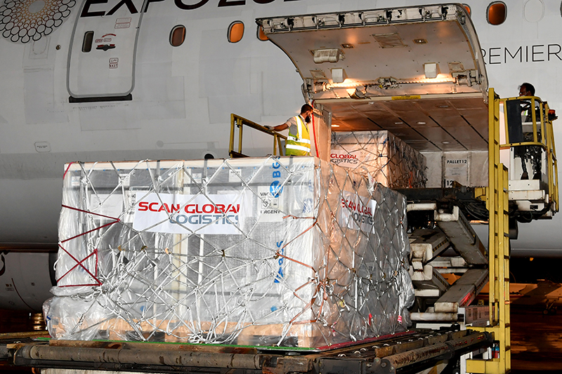 8月10日,在孟加拉国达卡机场,工作人员运送中国通过“新冠疫苗实施计划”供应孟加拉国的新冠疫苗。新华社发