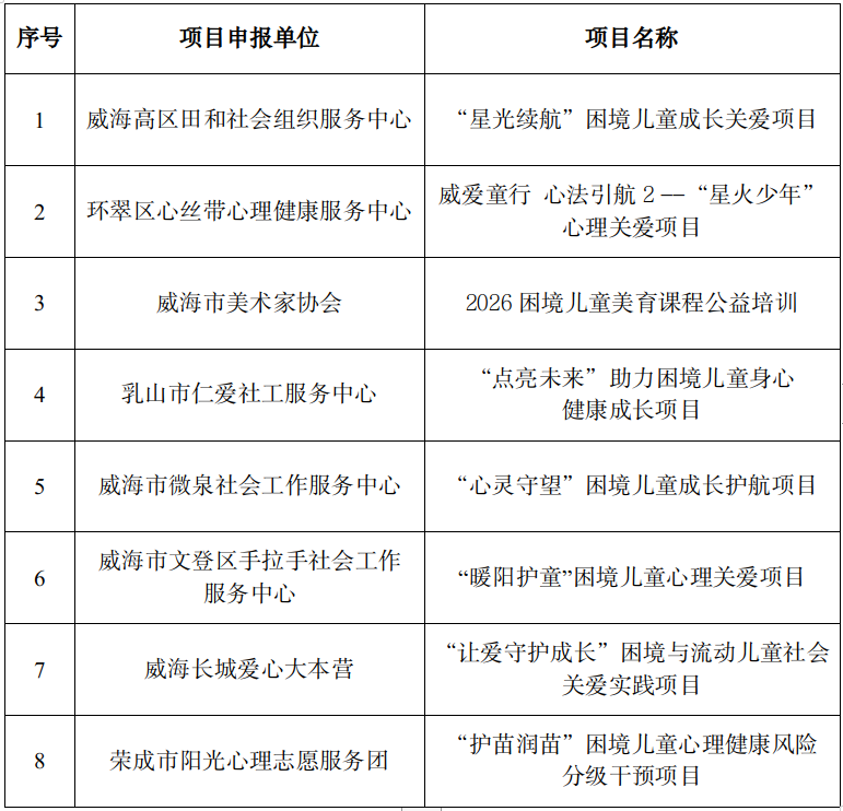 根据《2026年度“威海红帆 威爱童行”关爱困境儿童社会组织公益实践项目征集方案》有关要求,经专家评审,评选出8个“威海红帆 威爱童行”关爱困境儿童社会组织公益实践项目,拟对评审通过项目给予2至3万元不等的资金支持。现对支持项目予以公示,公示期为5个工作日,自2026年4月20日至24日。公示期间,如对公示项目有异议,请及时向威海市民政局儿童福利科反馈,反映问题需使用真实的姓名、联系电话和通讯地址。